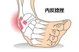 主に内反捻挫(ないはんねんざ)が多く、足首が内側にひねられる事により、外側靱帯複合体内側に(ATFL,CFL,PTFL)が損傷します、