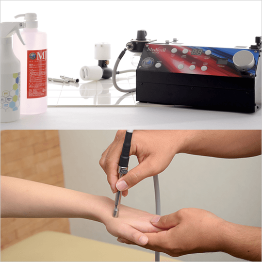 メディセルハイブリッドは、吸引する事によって皮膚と筋肉に隙間を作り、そこに特殊な電気を流す事によって筋膜の癒着を剥がします。